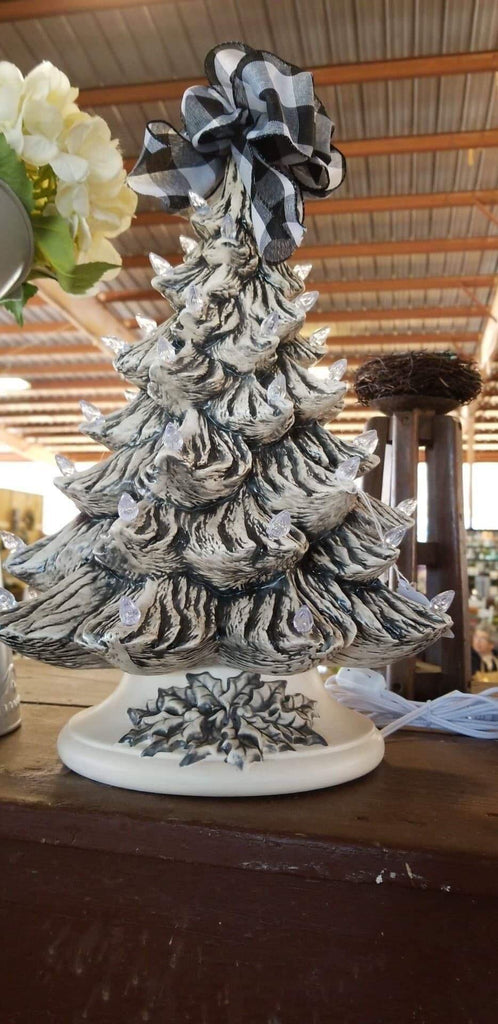 Ceramic Tree Made From Vintage Nowell Mold Painted Gray or Black with White Highlighting. Perfect for Farmhouse Décor. Trees in stock ship in 2-3 days, if out of stock, 4-6 weeks lead time to make and ship. Each tree is hand made s no two will be exactly alike. Made in the USA price includes freight to lower 48. Small handling and packaging fee will be added.