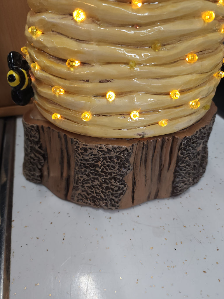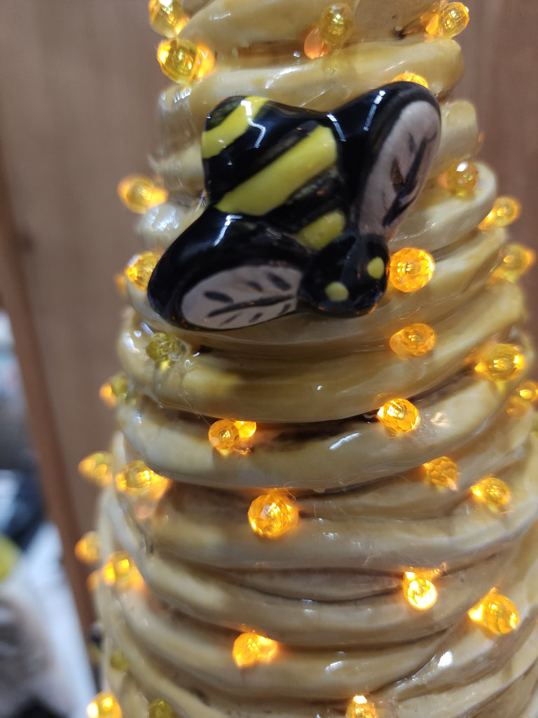 Beautiful Ceramic Vine Tree and Wood Accent Base. Tree is honey yellow with aging techinque and accented with handcrafted Ceramic honey bees and yellow pin lights. The woodgrain base is painted in brown and aged with black wash with mushroom accents.