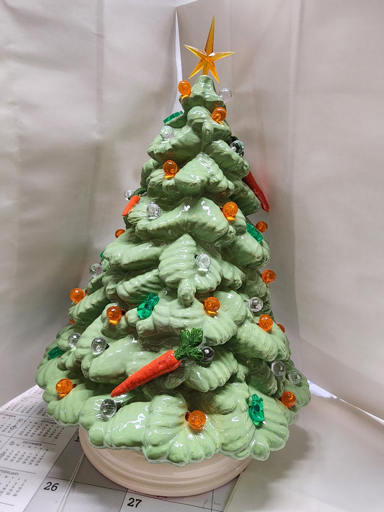 Beautiful Vintage mold glazed in Spring green and accented handcrafted Ceramic carrots. Round orange and clear globes with green bunny lights. These are made vintage Molds using the same techniques and glazes as grandma used. Each tree is handmade. Trees comes with a new in Light Kit with on/off switch. (Lights are not glued in) Leadtime ships within 3 business days , if in stock. If out of stock, please allow 4 - 6 weeks to make and process. A shipping tracking number will be emailed at time of shipment. Store pickup is also avail. Mark your order to SHIP to insure the correct paperwork is produced by the software.