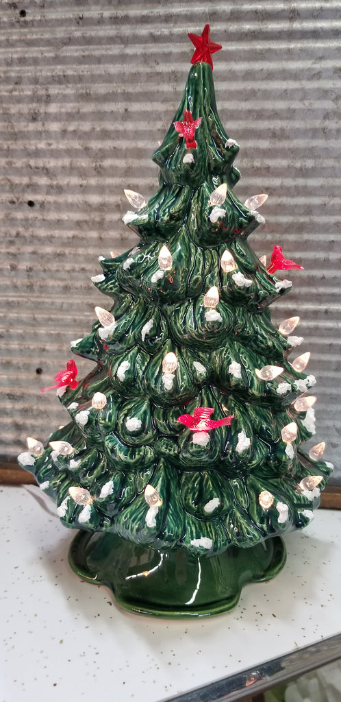 Rare Ceramic Tree made from Ceramichrome Mold. Trees are glazed in a beautiful multicolored Evergreen color with matching base. Tree limbs are tipped in snow with clear light twist and accented with redbirds. Star will be red or clear depending on availability. New light kit. Includes new tubular bulb. Price includes freight charge to lower 48. A small packaging fee will be added. Each tree is handmade and unique. No two trees are identical. Bulbs on this tree are not glued in. If you want them glued, please note the request on the order comments. We would be glad to do it for you. In stock tree ships within 3 days. If out of stock, allow 4 - 6 weeks to make and ship. A tracking number will be emailed upon shipment