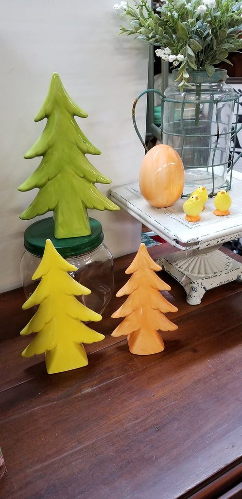 Set of 3 flat trees is glazed in fun Spring and Fall colors. These trees do not light up. If in stock, will ship within 3 business days. If out of stock will require 4-6 weeks to make. $40 includes UPS freight. A small packaging fee is added by the software to insure safe arrival. Packages sent via UPS Tracking number sent to email.