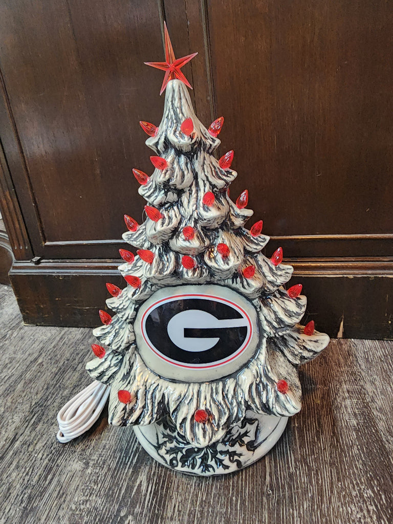 SKUBeautiful Vintage mold Ceramic Tree glazed with washed effect. These are made vintage Nowell Molds using the same techniques and glazes as grandma used. Each tree is handmade and fired to cone 4 several times. This tree has a choice of 2 Decal options and each tree is topped off with red light twist and a clear and a red star. (Depending on color availability) Light Kit with on/off switch. Trees are made by Talented artist here in Georgia. Leadtime ships within 48 hours , if in stock. If out of stock, please allow 6 weeks to make and process. A shipping tracking number will be emailed at time of shipment.