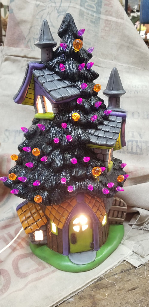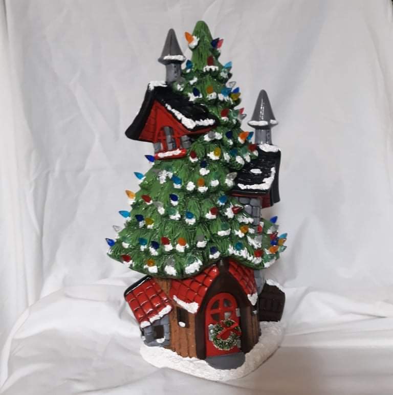 Lighted Ceramic Treehouse Tree painted and distressed in acrylics handmade in the USA. Includes new electric wiring. These make a perfect addition to your vintage ceramic tree display. 6 weeks Leadtime. Price includes UPS shipping to lower 48. A small packacking and handling fee will be added by software yo insure safe arrivsl.