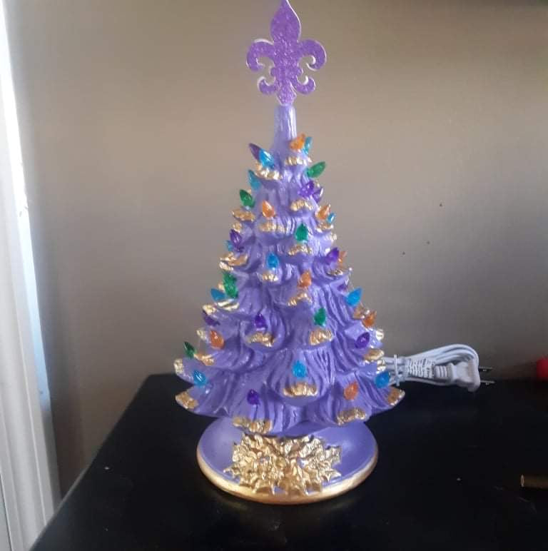SKU N10Ceramic Tree Made From Vintage Nowell Mold Painted in acrylics and sealed with ceramic sealer To reflect Mardis Gras Colors. Tree includes light twist, electrical cord, tree topper. Twist and topper are not glued in to make them safer during shipment. Trees in stock ship in 2-3 days, if out of stock, please allow 4-6 weeks lead time to make and ship. Each tree is hand made s no two will be exactly alike. Made in the USA price includes freight to lower 48. Small handling and packaging fee will be added.