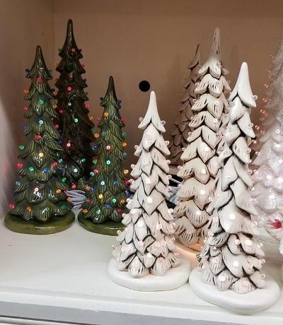 Gorgeous Set of three skinny ceramic trees in your choice: green, white or farmhouse glaze. Choice of clear or multi colored pin lights. 3 electrical light kits included. Each tree is handcrafted by Us.
