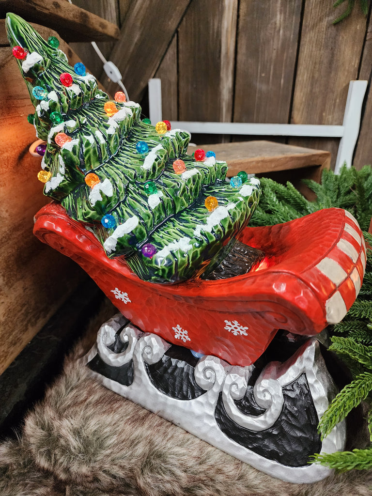 Beautiful handcrafted Ceramic Sled with lighted green glazed tree with snow.  Sled is painted in acrylics with a gorgeous antiquing wash and sealed with ceramic sealer. Tree is wired with new light kit. Be sure to 'Mark Ship" and bot store pickup to insure the right paperwork is created. Price includes freight charge to lower 48. A small packaging fee will be added.  Each tree is handmade and unique. No two trees are identical.  In stock tree ships within 3 business days. If out of stock, allow 6 weeks to make and ship.  A tracking number will be emailed upon shipment.