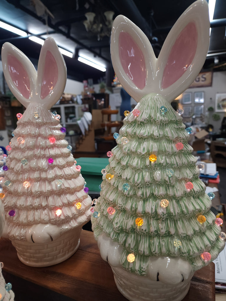 SKUBeautiful handcrafted Ceramic Easter Bunny Tree with basket weave base. Tree is glazed and fired to cone 4. It features a very cute set of bunny ears up top, little bunny feet on the front an cute little bunny tail on the back. New Electrical and pastel globes glued in. Price includes freight charge to lower 48. BE SURE TO MARK SHIP TO INSURE THE CORRECT PAPERWORK IS CREATED A small packaging fee will be added by the software. Each tree is handmade and unique. No two trees are identical. In stock tree ships within 3 business days. If out of stock, allow 4 - 6 weeks to make and ship. A tracking number will be emailed.