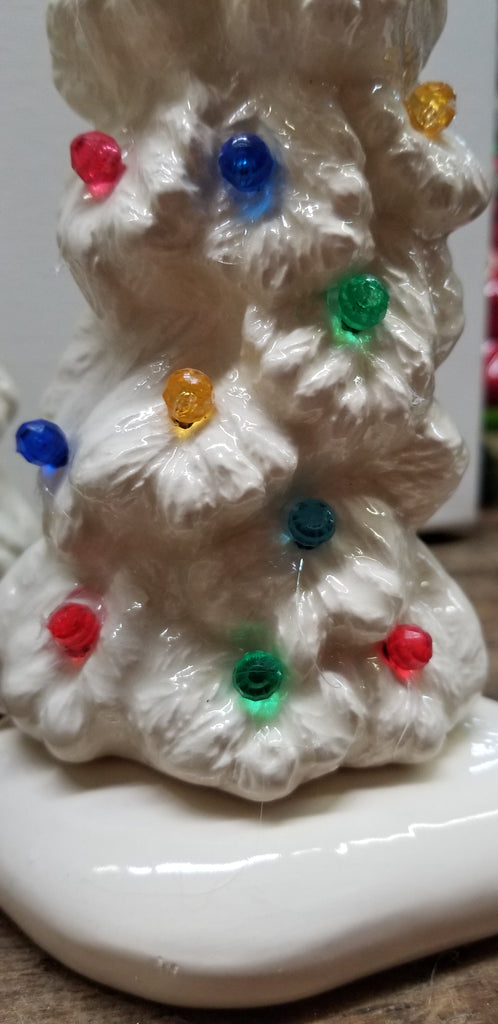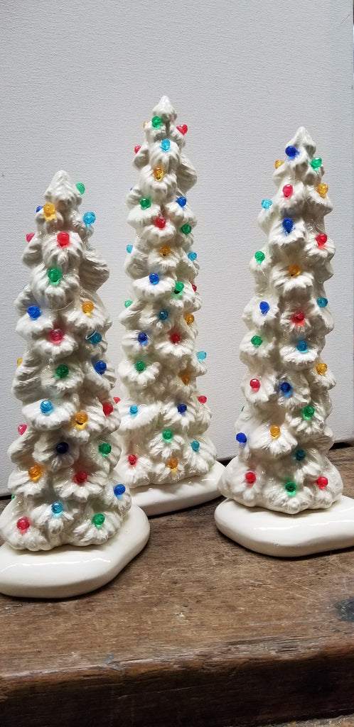 Gorgeous Set of three slim ceramic trees glazed in white glaze with multiple color pin light colors. Keep as a set or give as gifts.