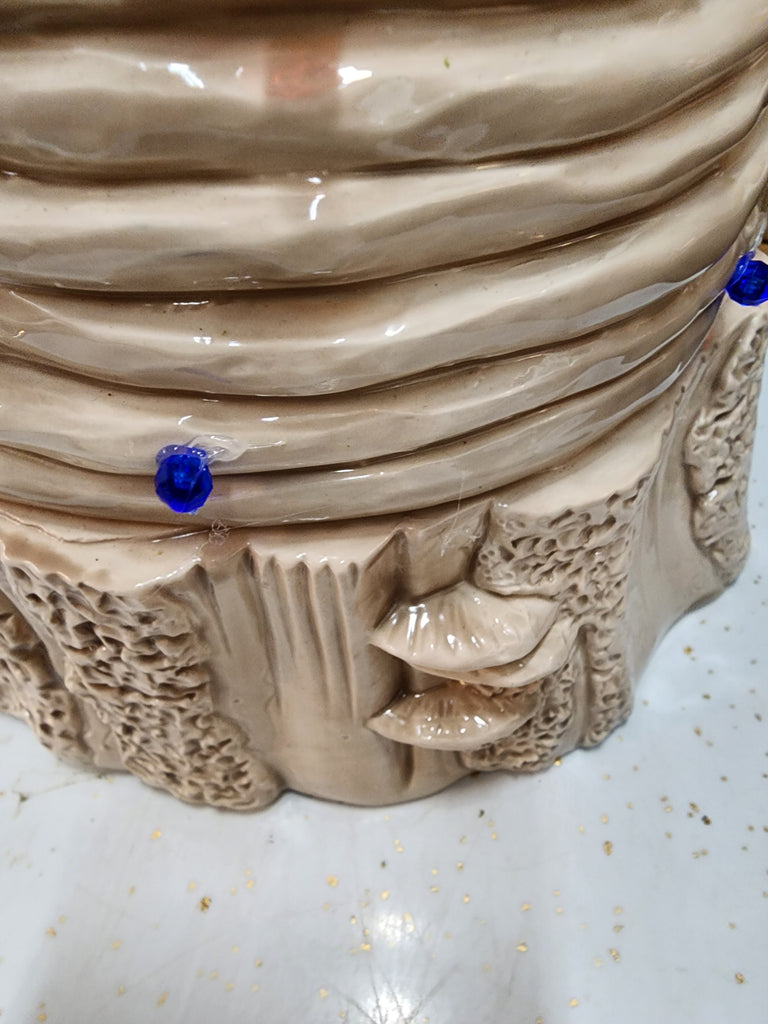 Beautiful Ceramic Tree Made with A Vine and Wood Accent Molds Tree with a beautiful taupe Glaze and vintage taupe base with woodgrain and mushroom accents. The tree is adorned with red, white and blue lights. The tree is topped with a beautiful red star.