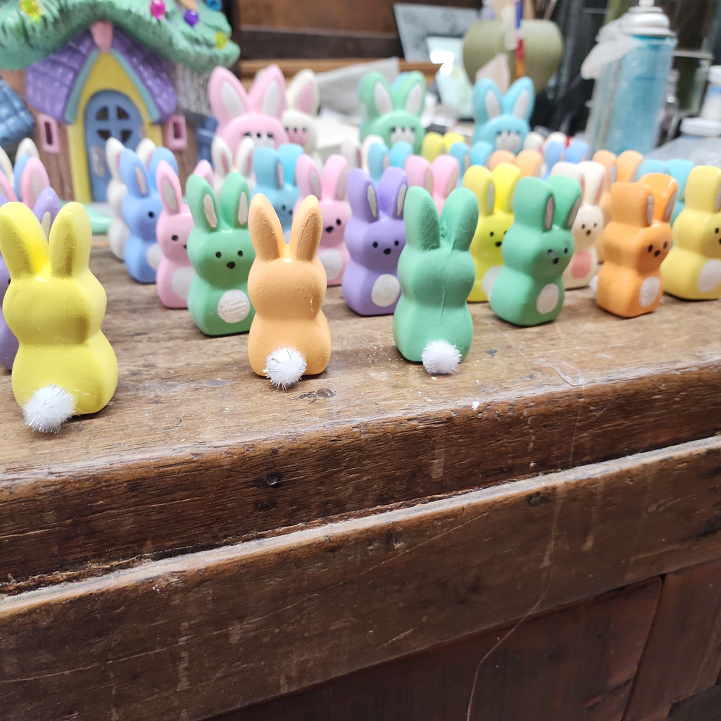 Handmade ceramic Easter Peeps with a cute little cotton tail.  Set of 4 different colors . Colors will be either pink, purple, yellow, green, blue, orange or white.