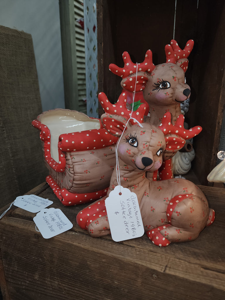 SKUSoftee Deer set with sleigh made from vintage molds...just like the 80s! Hand painted and antiqued in acrylic. They are just like grandmas was back on the day! Each piece is handcrafted and no 2 pieces will be identical. In stock items ship within 3 business days. Leadtime 4 - 6 weeks to make and ship, if out of stock. Price includes freight east of Mussissippi. If west of Mississippi we will add $30 due to distance and oversize packaging