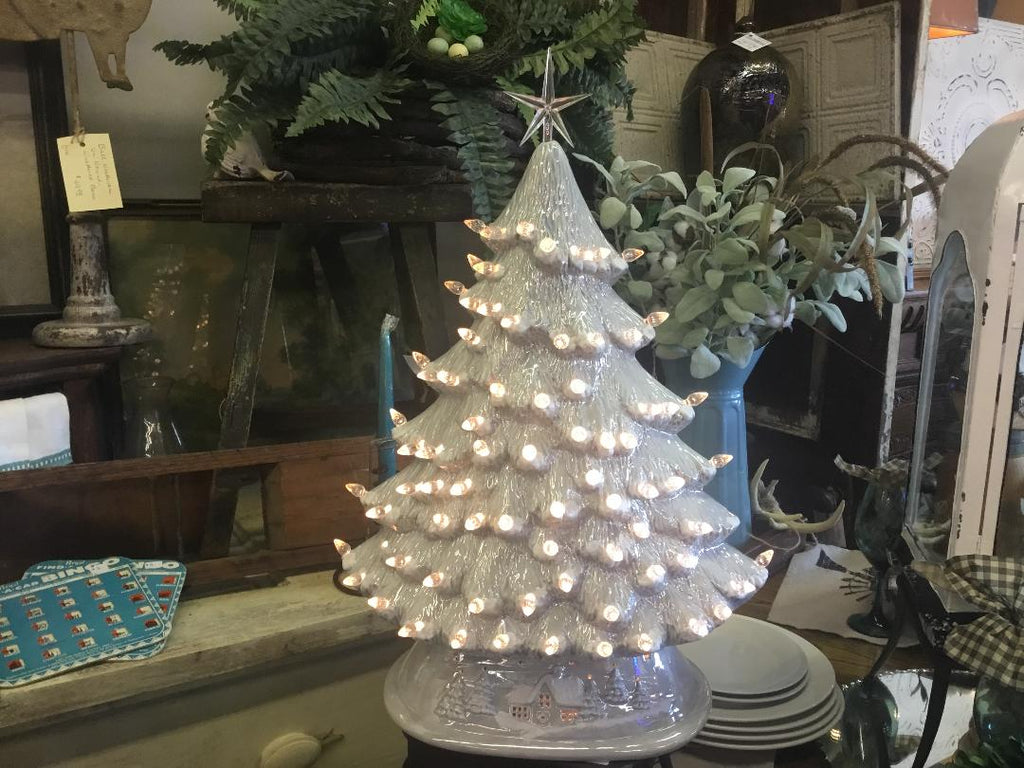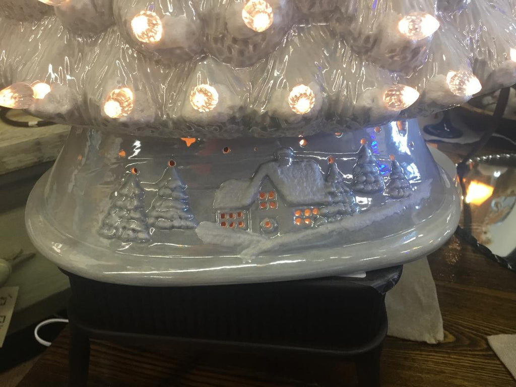 18-20" tall . Glazed a ridescent light gray glazed tree.  The base has a lighted Christmas Village Scene.  Tree comes with clear light twist, start, and light kit.  Trees are handcrafted in the USA.  If not of stock. Leadtime is 4 - 6  Weeks to make.  Shipping is included to lower 48. A small packaging fee will be added to cover materials to insure it arrives safely. Be sure to mark ship or the system will flag it as pickup.