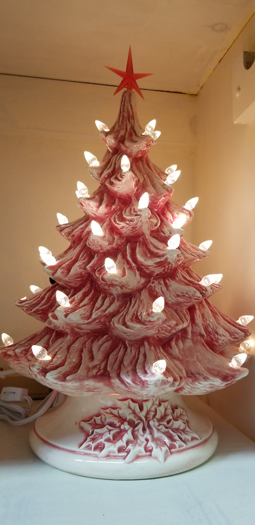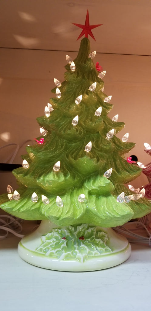 SKUCeramic Tree Made From Vintage Nowell Mold Painted in our in-house peppermint or lime green glaze. Trees are wired with light kit and come with clear unglued Light twist. Perfect for Christmas and Valentine decor. Trees in stock ship in 2-3 days, if out of stock, 4-6 weeks lead time to make and ship. Each tree is hand made and no two will be exactly alike. Made in the USA price includes freight to lower 48. Small handling and packaging fee will be added.