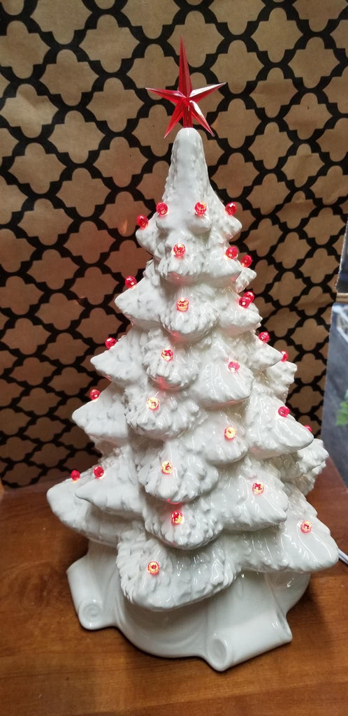 Glazed Ceramic Tree made with rare vintage Kimple mold. Each tree has with lots of texture and creamy white scalloped bas and red pin light twist. Lights are not glued in to allow them to be changed out with the season. If you want them glued in..please add an order comment.